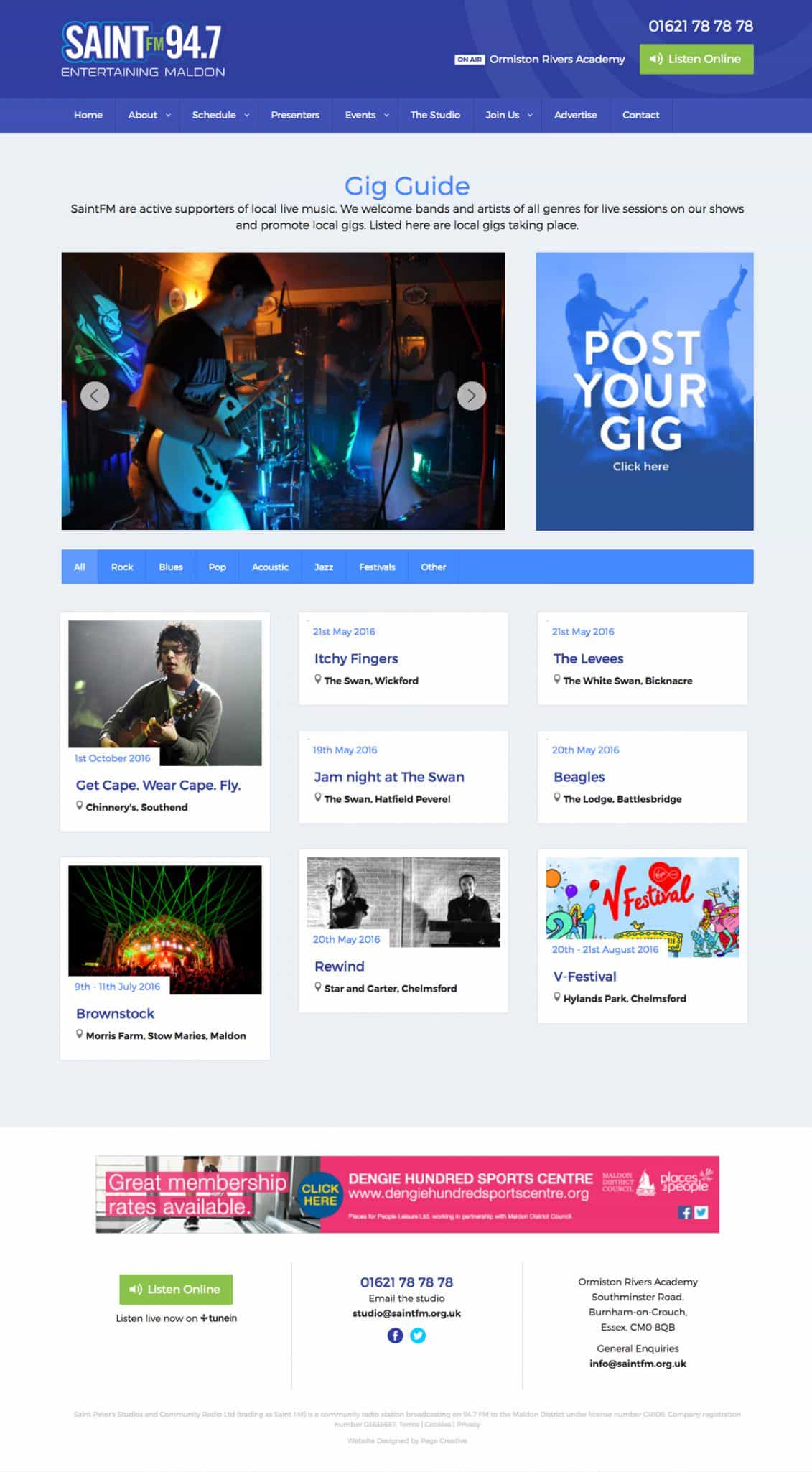 In a bid to compete against the growing rise of online radio stations, SaintFM (a Maldon based FM local radio station) commissioned Page Creative to develop a completely new brand identity for application across all visual assets from apps to websites, to roadshow signage and in studio displays.